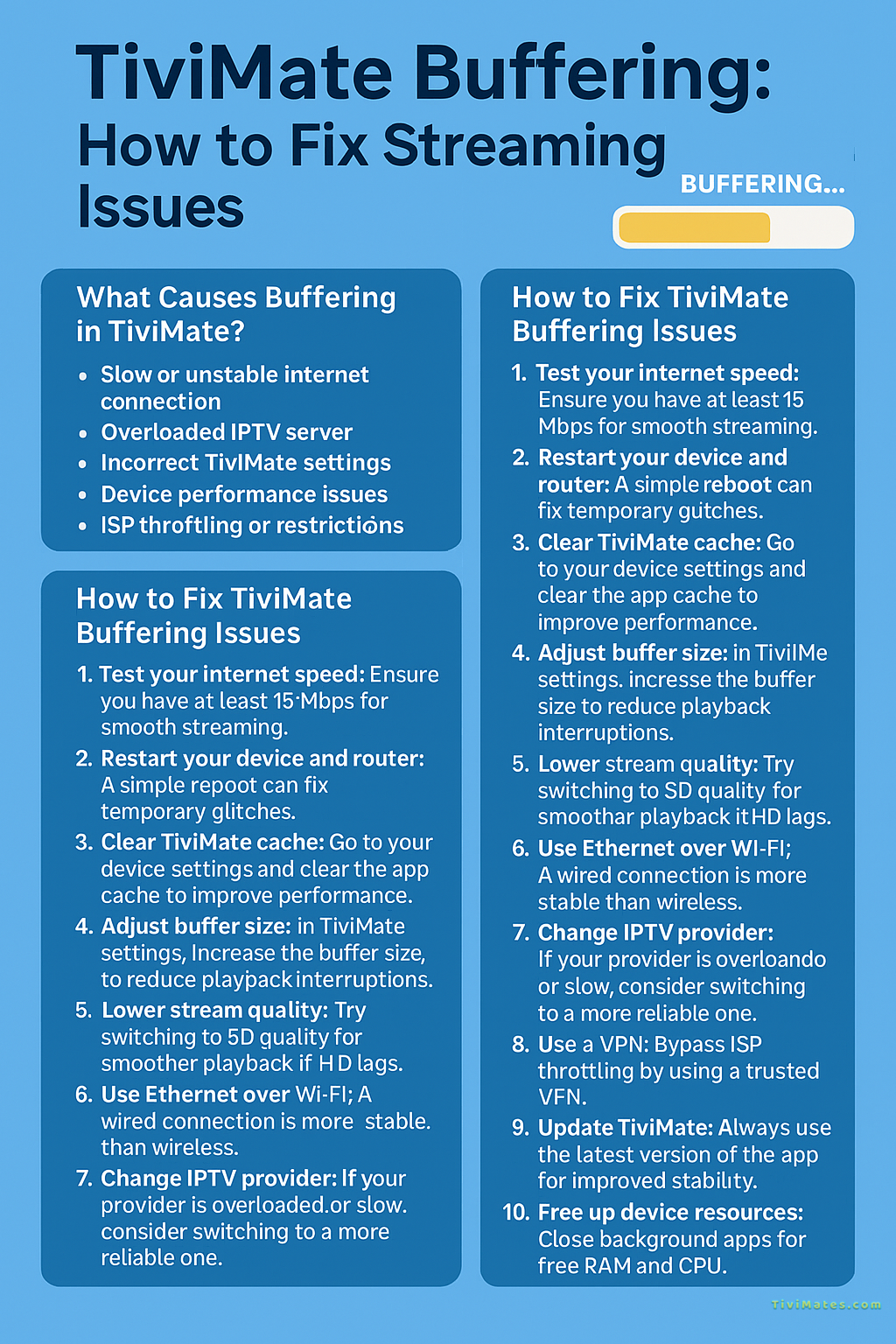 TiviMate Buffering: How to Fix Streaming IssuesFix TiviMate Buffering Issues: Full Guide to Smooth IPTV Streaming (2025)Fix TiviMate Buffering Issues: Full Guide to Smooth IPTV Streaming (2025)